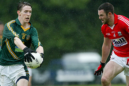 Cork's Noel Galvin closes in on Bryan McMahon Meath during a SFC challenge game at Skryne.