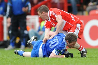 Derry's Brian Mullan and Monaghan's Conor McManus during the Ulster SFC clash.
