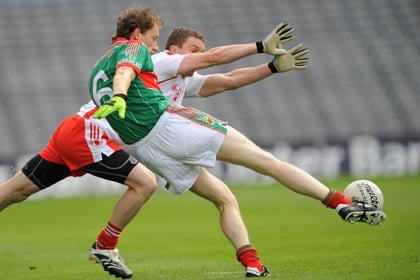Mayo's James Nallen gets in his clearance despite the efforts of Tyrone's Tommy McGuigan to block.